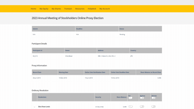 When your employees login to their employee portal on Global Shares, they’ll see the number of shares available with which they can vote on.